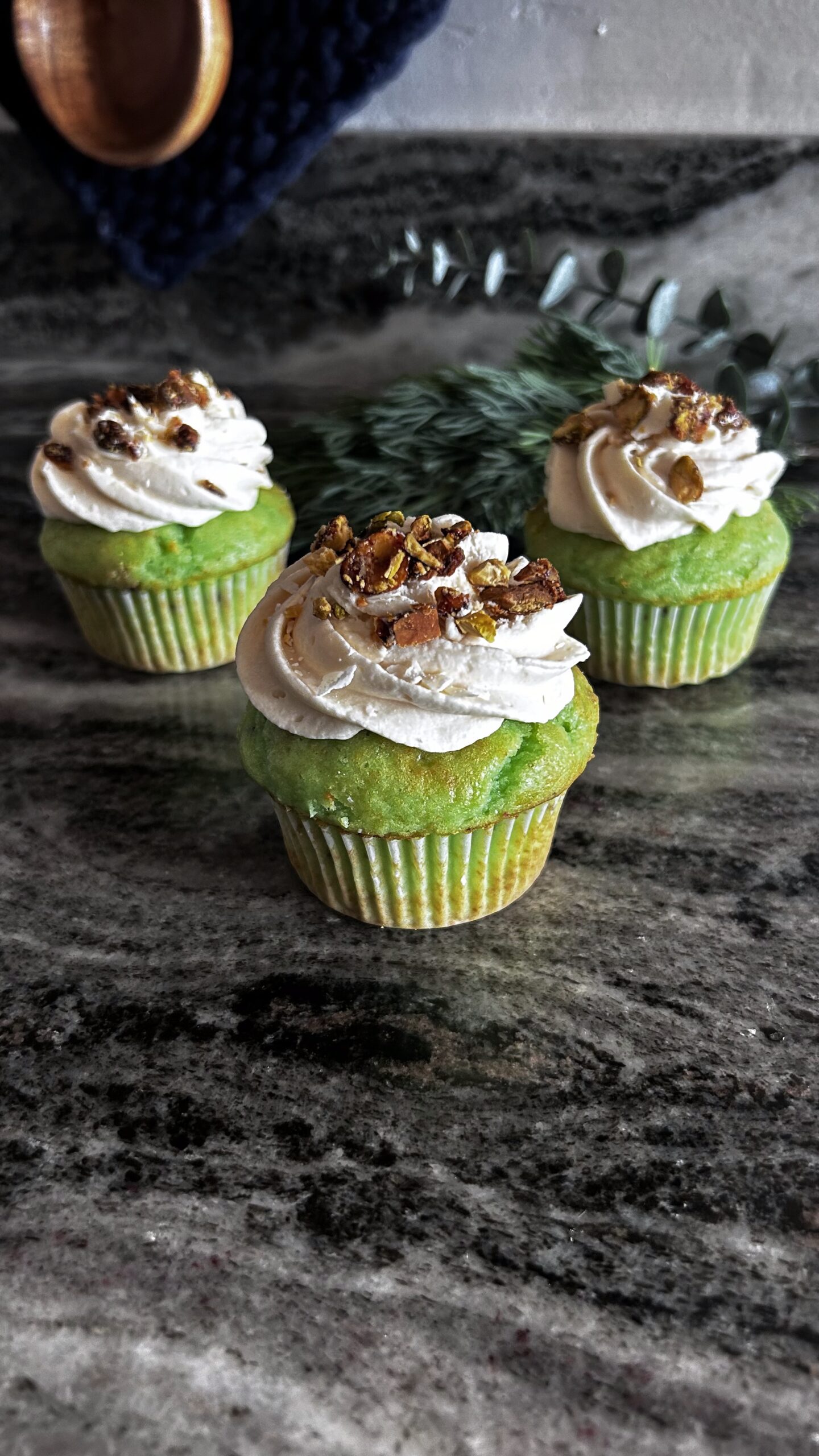 Pistachio cupcakes with a whipped white chocolate ganache frosting then topped with candied pistachios.